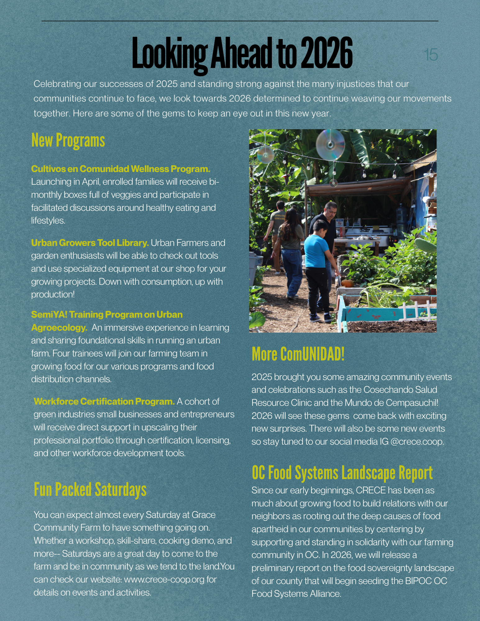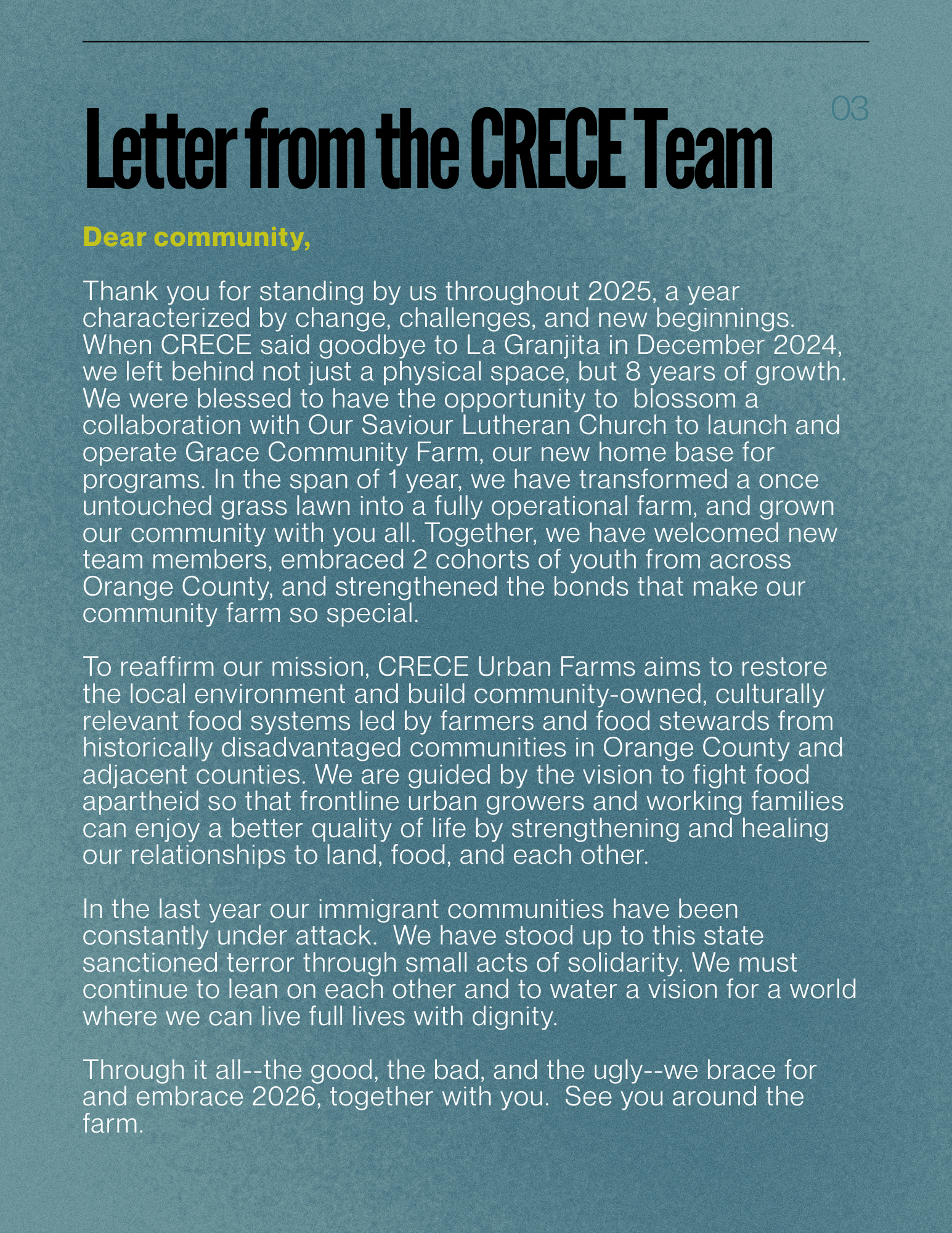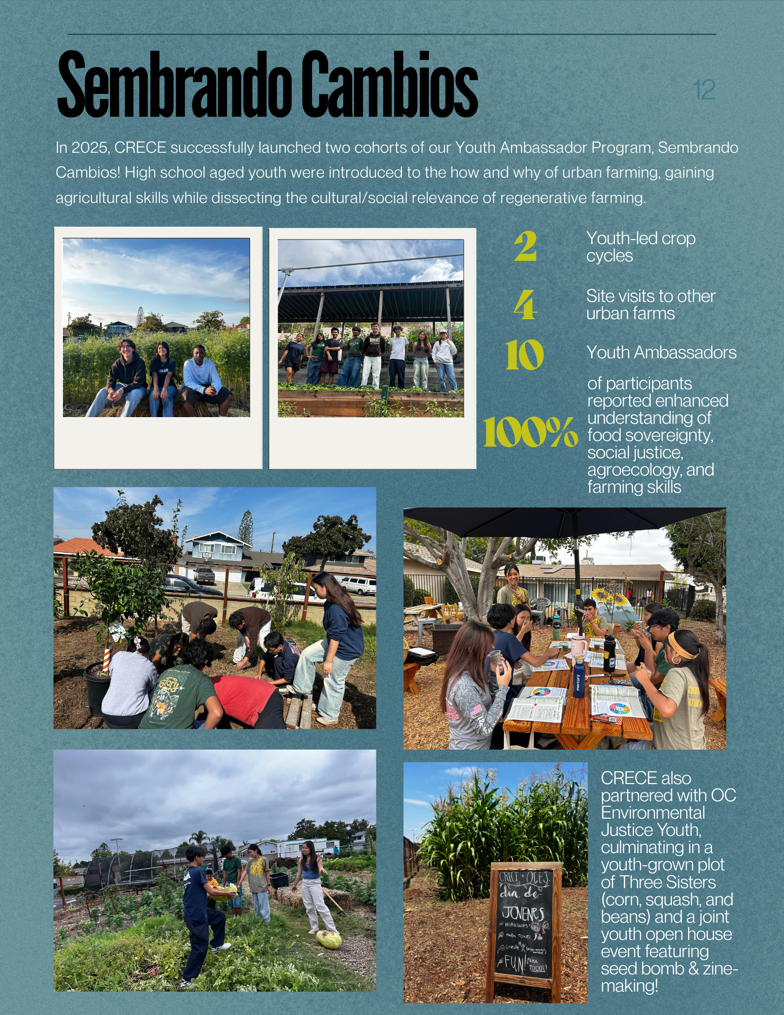 Thank you for standing by us throughout 2025, a year characterized by change, challenges, and new beginnings. When CRECE said goodbye to La Granjita in December 2024, we left behind not just a physical space, but 8 years of growth. We were blessed to have the opportunity to blossom a collaboration with Our Saviour Lutheran Church to launch and operate Grace Community Farm, our new home base for programs. In the span of 1 year, we have transformed a once untouched grass lawn into a fully operational farm, and grown our community with you all. Together, we have welcomed new team members, embraced 2 cohorts of youth from across Orange County, and strengthened the bonds that make our community farm so special.